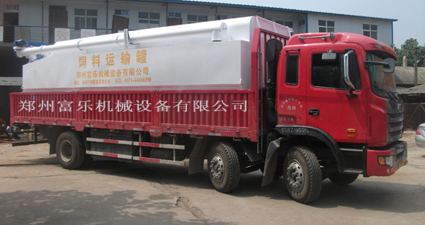 鄭州富樂機械設備有限公司 散裝飼料運輸車主要用于從飼料廠向畜牧場養(yǎng)禽場及飼料加工用戶運輸散裝飼料成品或飼料生產原糧,同時它也可用來運輸某些無腐蝕性粉粒狀原料,如制藥廠粉料和糧庫周轉。散裝飼料車的飼料罐架設在卡車的底盤上,罐頂開有進料口.頂部的一根螺旋輸送卸料管(俗稱卸料絞龍)則可自由回轉和抬升,抬升的仰角可達60度。運輸時,頂部的螺旋管平臥在罐頂;卸料時則抬起,使管端的出料口與畜禽飼養(yǎng)場貯料罐頂部的進料門相接,駕駛室內裝有操縱裝置(操縱裝置也可裝置在罐體尾部),卸料時通過車底的動力輸出軸和減速器來驅動螺旋,以完成卸料。目前國內主要推出3T、5T、8T、10T、15T、20T和30T等多個噸位車型。