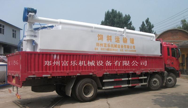 鄭州富樂機(jī)械設(shè)備有限公司生產(chǎn)的散裝飼料車的飼料罐架設(shè)在卡車的底盤上,專用設(shè)施由罐體總成、輸送系統(tǒng)(水平卸料系統(tǒng)、垂直卸料系統(tǒng)以及活動(dòng)卸料系統(tǒng)組成)、散裝飼料車罐液壓系統(tǒng)(高壓油泵經(jīng)管路與分配閥連接該閥的三個(gè)輸出端分別是轉(zhuǎn)角液壓馬達(dá)、升降油缸以及串聯(lián)在一起的水平卸料、垂直卸料、活動(dòng)卸料液壓馬達(dá))、散裝飼料車罐電動(dòng)系統(tǒng)、氣動(dòng)分倉(cāng)機(jī)構(gòu)等組成。在罐體底部設(shè)有閘門,在閘門下面裝有水平螺旋輸送器(俗稱水平攪籠),由取力器由汽車變速箱輸出動(dòng)力驅(qū)動(dòng),再傳動(dòng)高壓油泵以驅(qū)動(dòng)液壓系統(tǒng),散裝飼料車罐液壓馬達(dá)通過傳動(dòng)裝置帶動(dòng)水平螺旋輸送器的葉片軸及葉片旋轉(zhuǎn),經(jīng)活動(dòng)輸送系統(tǒng)(俗稱活動(dòng)攪籠)以將飼料輸出。車頂平置的一根活動(dòng)卸料絞龍可自由回轉(zhuǎn)和抬升,運(yùn)輸時(shí)頂部的螺旋管平臥在罐頂;卸料時(shí)則抬起,散裝飼料車罐使管端的出料口與畜禽飼養(yǎng)場(chǎng)貯料罐頂部的進(jìn)料門相接、對(duì)準(zhǔn),完成卸料。