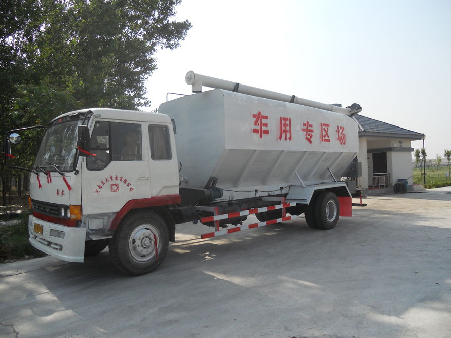 散裝飼料車的飼料罐架設(shè)在卡車的底盤上,罐頂開有進(jìn)料口.頂部的一根螺旋輸送卸料管(俗稱卸料絞龍)則可自由回轉(zhuǎn)和抬升,抬升的仰角可達(dá)60度。運(yùn)輸時(shí),頂部的螺旋管平臥在罐頂;卸料時(shí)則抬起,使管端的出料口與畜禽飼養(yǎng)場(chǎng)貯料罐頂部的進(jìn)料門相接,駕駛室內(nèi)裝有操縱裝置(操縱裝置也可裝置在罐體尾部),卸料時(shí)通過車底的動(dòng)力輸出軸和減速器來(lái)驅(qū)動(dòng)螺旋,以完成卸料。目前國(guó)內(nèi)主要推出3T、5T、8T、11T、15T和22T等多個(gè)噸位車型。